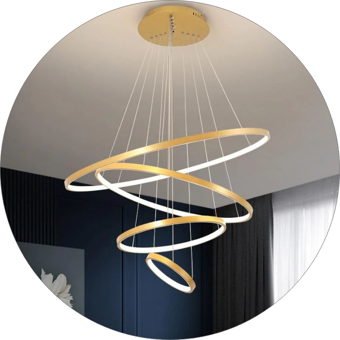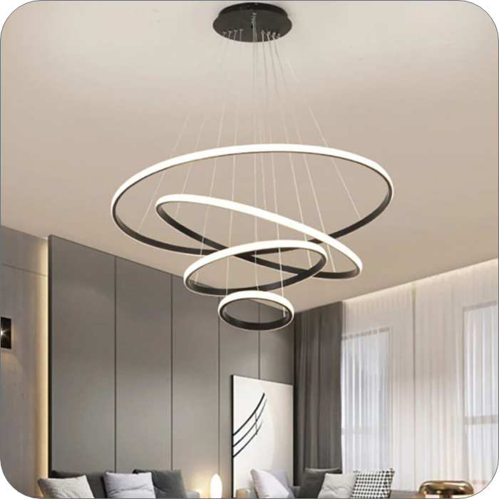 • لوستر شامل چهار حلقه با سایزهای ۳۰، ۵۰ و ۹۰ سانتی‌متر است که به صورت هماهنگ طراحی شده و جلوه‌ای مدرن و چشم‌نواز ایجاد می‌کند.