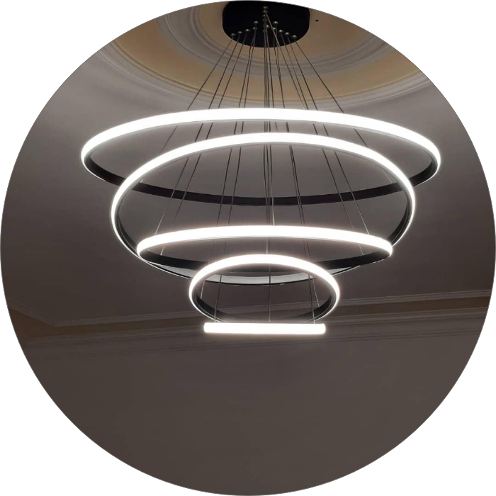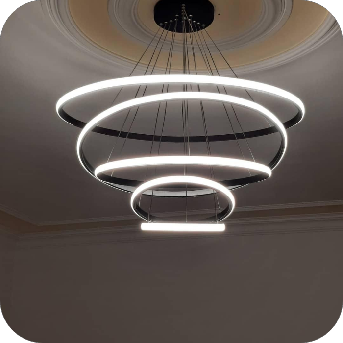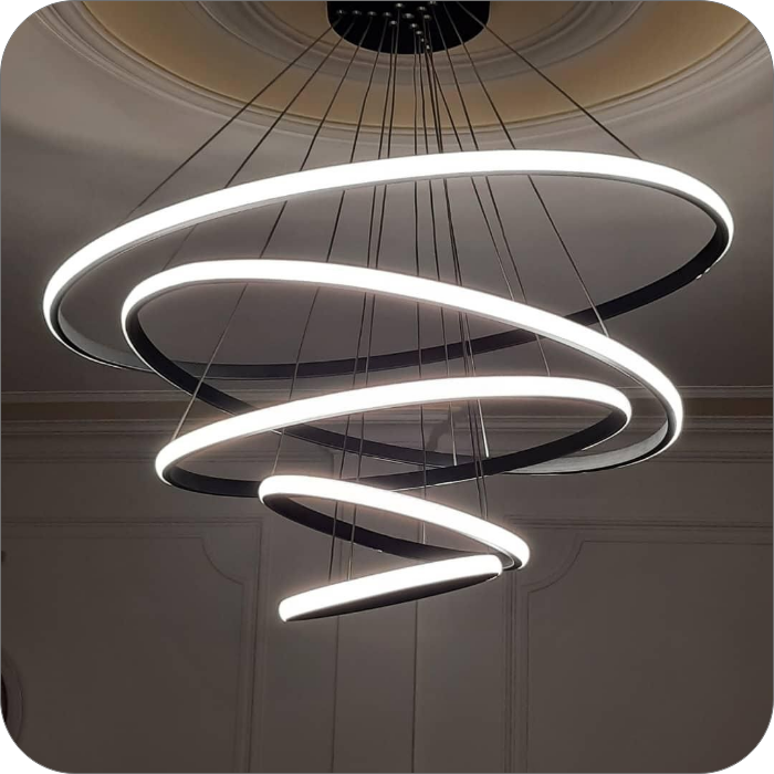 • حتی می‌توان با تنظیم نابرابر آویزها، فرم هنری و پویایی در چیدمان نور ایجاد کرد.